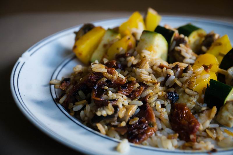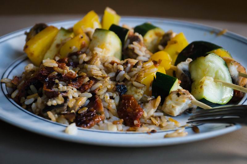 Die Spieße derweil in einer Pfanne ca. 10-15 Minuten anbraten und auf kleinerer Flamme stehen lassen. Die getrockneten Tomaten werden in der Pfanne angeröstet, sobald der Reis fertig ist. Denn der fertig gekochte Reis wird zum Anbraten in die Pfanne mit den Tomaten gegeben und für ein paar Minuten stehen gelassen. Wer nun auch noch die Spieße in die Pfanne mit dem Reis gibt, hat das Aroma der getrockneten Tomaten überall-und somit die „besondere Note“ des Gerichts geschaffen.