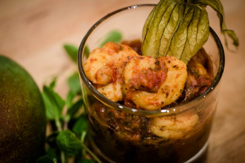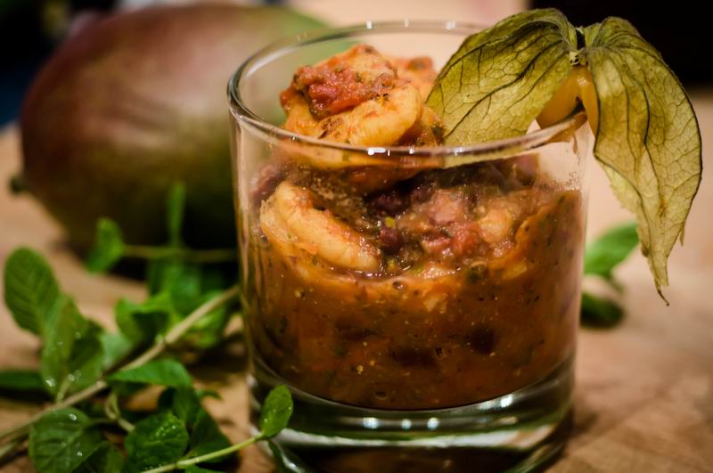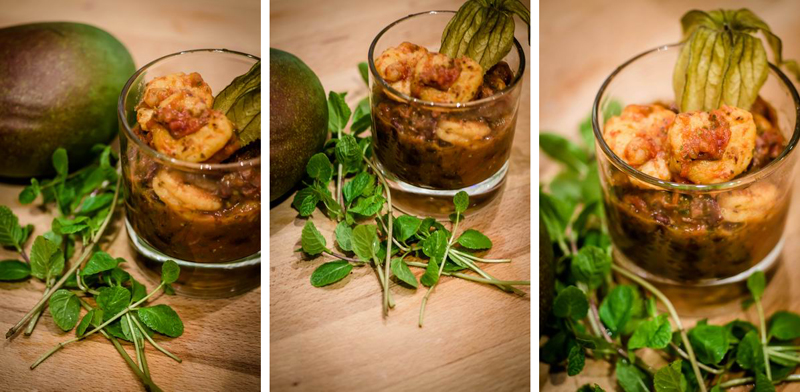 _Die Garnelen in der Pfanne anbraten. Wenn sie fertig sind, die Tomaten und die Kidneybohnen dazugeben. Anschließend alles zusammen köcheln lassen und würzen. Wer mag kann auch etwas Mangochutney dazugeben, was dem Ganzen eine süße Note verleiht. Wer sowas nicht zur Hand hat, versucht es mit einer kleingeschnittenen, halben Mango. Die Zutaten auf kleiner Stufe ein paar Minuten ziehen lassen.