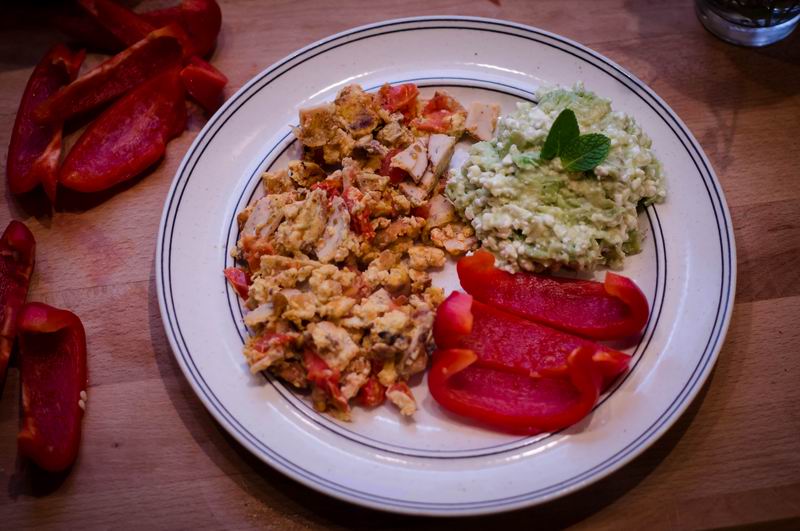 _ Das Ei mit der Tomate und der Hühnchenbrust inklusive der Gewürze in der Pfanne zu Rührei verarbeiten. Währenddessen die halbe Avocado und den Frischkäse vermischen und die Paprika verzehrfertig zum nebenher essen in Streifen schneiden.