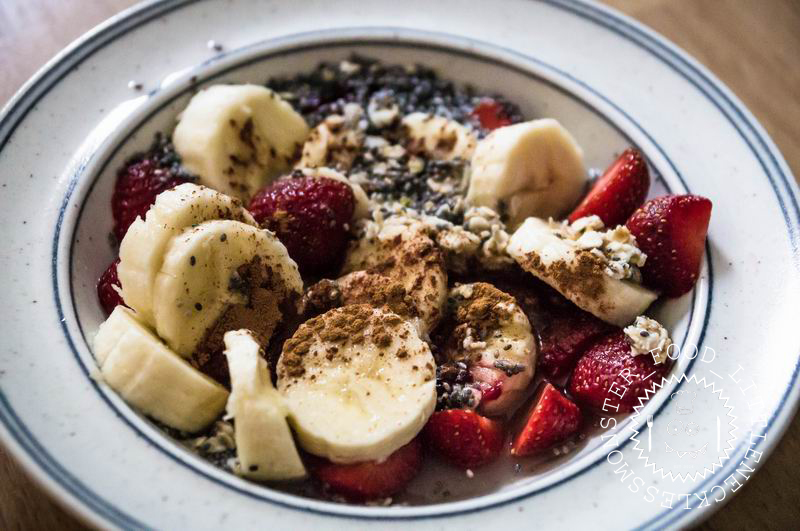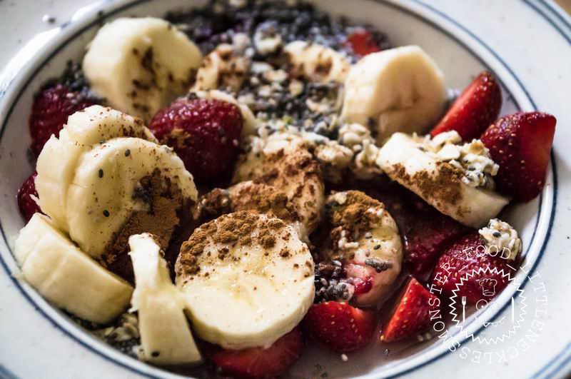 _Die Banane und die Erdbeeren in kleine Stücke schneiden. Die Haferflocken und Chia Samen entweder mit normaler Milch, Sojamilch oder etwas heißem Wasser aufquellen lassen. Wer Sojamilch oder Wasser verwendet, hat die vegane Variante und es ist sogar detoxgeeignet. Zuletzt alles vermischen und gerne noch etwas mit Zimt verfeinern.