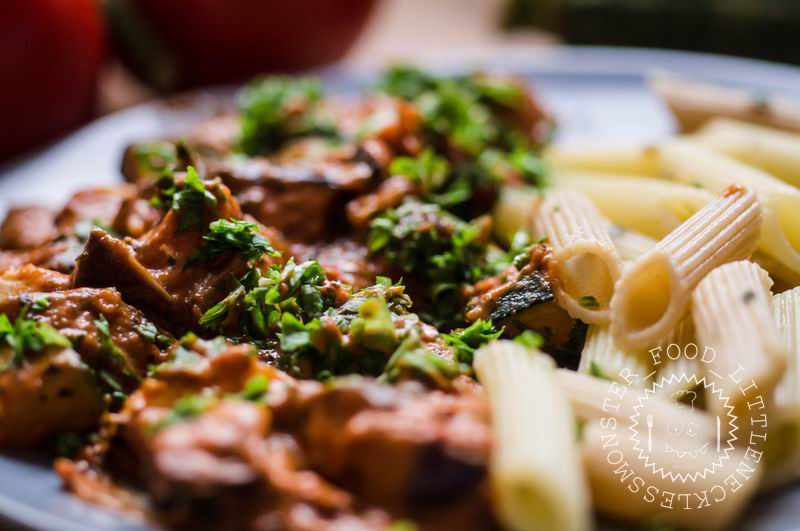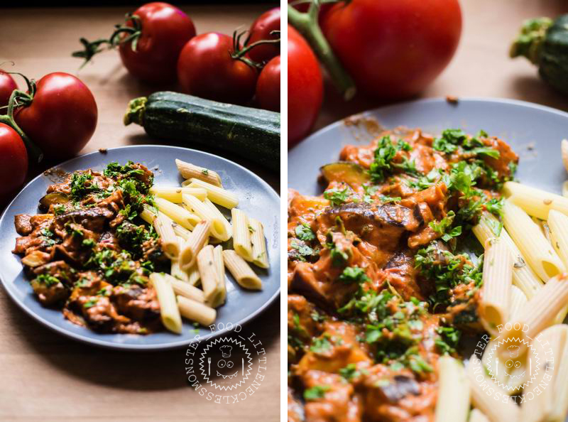 Und so wurde ich kreativ. Ich wollte Nudeln mit einer leckeren und vor allem einfachen Sauce. Hatte aber noch Zucchini und Aubergine. Deshalb ging das große Schnibbeln los. Als das Gemüse in der Pfanne war und die Nudeln im Wasser (natürlich hatten wir auch keine wie vorher gewünschten Spagetthi mehr – wenn schon, denn schon ;) ), habe ich mir zum ersten Mal Gedanken gemacht, was ich denn überhaupt kochen möchte. Das Brutzeln auf dem Herd hat einen dabei etwas unter Zugzwang gestellt. Zum Glück war im Kühlschrank – dem allzeit besten Freund – noch etwas drin. Zuerst kam dann Tomatenmark in die Pfanne und anschließend italienische Kräuter (in Öl), ersatzweise auch gerne Pesto.