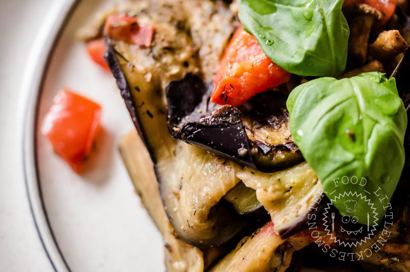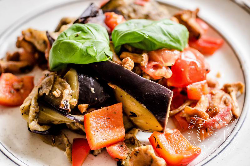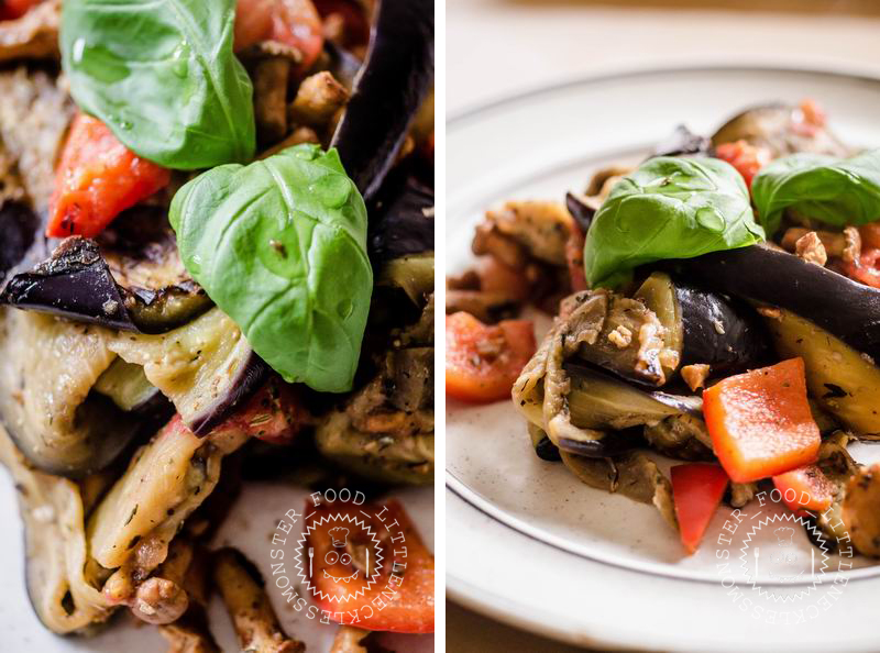 _ Die Aubergine in schmale Scheiben schneiden. Die Paprika ebenfalls in kleine Stücke schneiden. Olivenöl zum Anbraten in eine Pfanne geben und warm werden lassen. Das geschnittene Gemüse und die Pilze anbraten und mit den Gewürzen abschmecken. Alles durchziehen lassen und servieren.