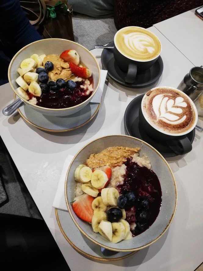 Und so schnell und einfach wie sich das Porridge zubereiten lässt, habt ihr auch noch genug Zeit um den Moccha oder einen Latte Macchiatto zuzubereiten. Für das Porridge braucht ihr als allerwichtigstes und als die Grundzutat schlechthin natürlich Haferflocken. Und um die exotische und erfrischende Note wie damals bei uns in Irland hinzubekommen, sind frische Früchte und ein paar Kokosflocken genau das richtige. Overnight Oats heißt im übrigen genau das, was es auch übersetzt bedeutet: Die Haferflocken können am Abend zuvor schon zubereitet werden (mit Milch und Kokosflocken heiß aufkochen) und über Nacht schön ziehen, damit es zu einem richtigen Brei wird. Wer die Zeit nicht hat, oder sich spontan dazu entscheidet ein Porridge zu machen, für den gibt es auch die schnellere Variante mit heißem Wasser oder heißer Milch. Besonders gut schmeckt es mit Hafermilch und einem Schuss Kokosmilch. Die heiße Milch oder das heiße Wasser auf die Haferflocken schütten und die Banane gerne zerquetscht mit drunter mischen, alles gut vermischen und durchziehen lassen. In der Zwischenzeit kann schon das Obst geschnitten werden. Noch so eine Sache, die ich an Porridge sehr gerne mag: nicht nur, dass es sehr leicht zubereitet ist, sondern dass man alles parallel machen kann und somit sehr wenig Zeit braucht um sich ein gesundes Frühstück oder einen Snack für zwischendurch zu zaubern.