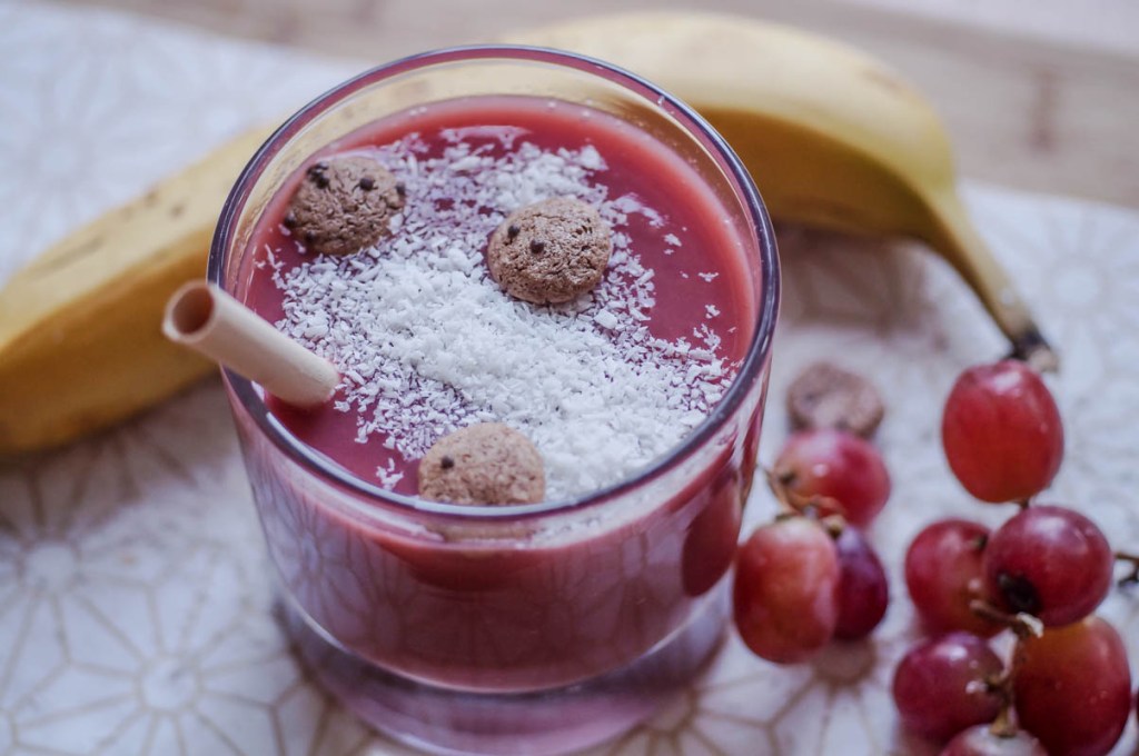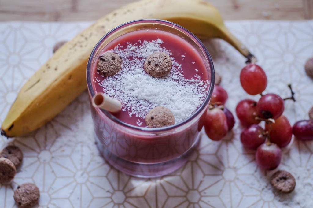 _Banane und Apfel in kleine Stücke schneiden und in den Mixer geben, Himbeeren und Trauben hinzufügen. Je nach gewünschter Konsistenz mehr oder weniger Wasser dazugeben und alles gut durchmixen. Beim Servieren könnt ihr etwas Kokosraspeln verwenden oder auch Früchte ganz nach Geschmack. Viel Spaß dabei! :)