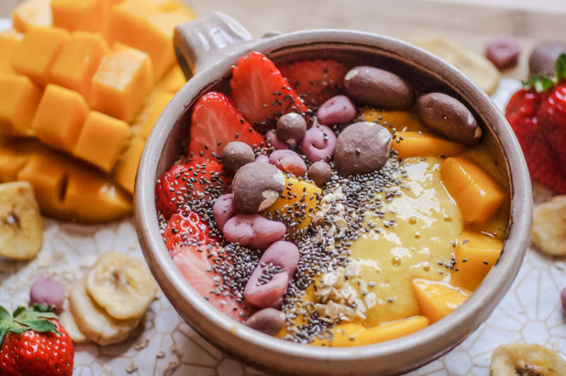 Anzeige | Stellt euch folgendes vor: Ihr wacht morgens auf, die Sonne scheint durchs Fenster, draußen zwitschern die Vögel und ihr könnt schon am Himmel erkennen, dass es wettertechnisch ein guter Tag heute werden wird. Und auch generell habt ihr einfach im Gefühl: Heute wird es gut! Wenn der Morgen schon so schön beginnt, kann der restliche Tag auch nur schön werden! Klingt nach einem Traum? Ja, könnte auch einer sein, aber in letzter Zeit wird es ja zum Glück wieder frühlingshafter und wärmer und somit werden solche Vorstellungen dann eben doch ganz schnell zur Realität. Und stellt euch nun zu einem solch perfekten Morgen auch noch ein leckeres Frühstück in Form einer Mango Bowl vor – mit vielen frischen Früchten und natürlich allerlei Toppings, die den ganz besonderen Geschmack ausmachen. Und dieser ist bei meinem heutigen Rezept wirklich sehr besonders! Oder kanntet ihr vorher schon Delikatessen wie Rubinschokolade? :)