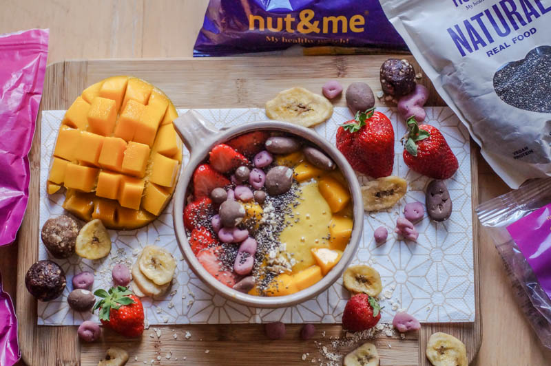 Rubinschokolade von nut&me – das sind die rosafarbenen Stückchen auf der Bowl – ist eines der vorzüglichen Toppings, die ich für diese sommerliche Mango Bowl verwendet habe. Der Smoothie, der als Grundlage dient, ist übrigens wieder sehr leicht zubereitet – man braucht lediglich eine Mango, etwas Haferflocken und Wasser. Die Haferflocken sorgen hierbei für die cremige Konsistenz und das ist bei der Bowl wichtig, damit die Toppings nicht im wahrsten Sinne des Wortes untergehen. Als weitere Toppings habe ich übrigens Chia-Samen, Bananenchips und mit Schokolade ummantelte Pekannüsse von nut&me verwendet. Bei nut&me gibt es alles rund um gesunde Snacks, Superfoods und Leckeres für Müslis, Bowls und Co.