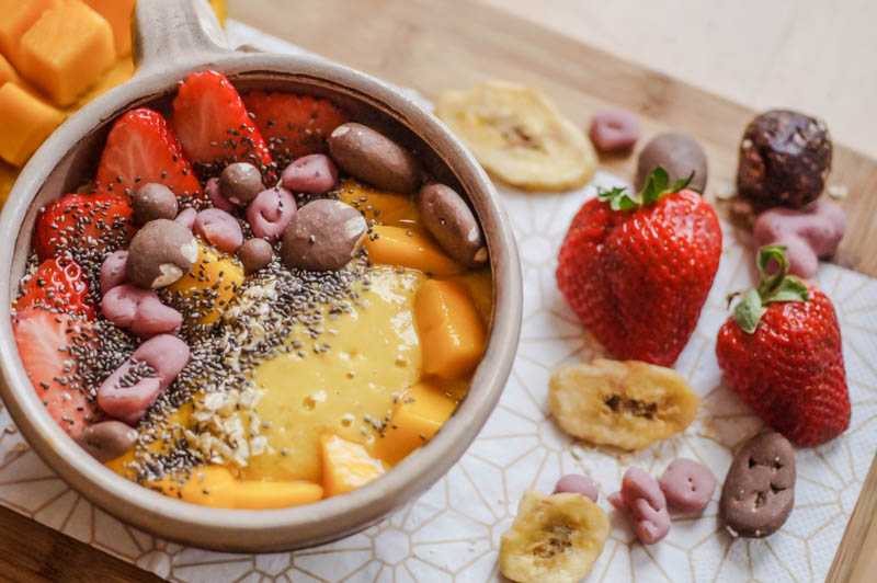 Anzeige | Stellt euch folgendes vor: Ihr wacht morgens auf, die Sonne scheint durchs Fenster, draußen zwitschern die Vögel und ihr könnt schon am Himmel erkennen, dass es wettertechnisch ein guter Tag heute werden wird. Und auch generell habt ihr einfach im Gefühl: Heute wird es gut! Wenn der Morgen schon so schön beginnt, kann der restliche Tag auch nur schön werden! Klingt nach einem Traum? Ja, könnte auch einer sein, aber in letzter Zeit wird es ja zum Glück wieder frühlingshafter und wärmer und somit werden solche Vorstellungen dann eben doch ganz schnell zur Realität. Und stellt euch nun zu einem solch perfekten Morgen auch noch ein leckeres Frühstück in Form einer Mango Bowl vor – mit vielen frischen Früchten und natürlich allerlei Toppings, die den ganz besonderen Geschmack ausmachen. Und dieser ist bei meinem heutigen Rezept wirklich sehr besonders! Oder kanntet ihr vorher schon Delikatessen wie Rubinschokolade? :)