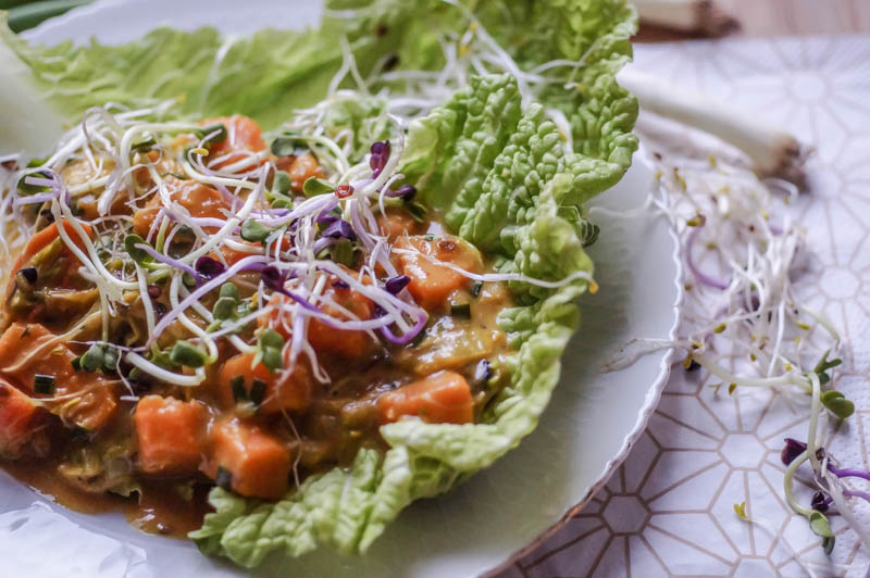 Süßkartoffeln haben mich letztens sehr angelacht und auch der Chinakohl musste einfach mit eingekauft werden. Die Sprossen sehen nicht nur super erfrischend aus, sondern runden dieses Rezept auch noch perfekt ab. Und leicht zubereitet ist dieses Rezept natürlich auch – sodass man es auch schnell ausprobieren und nachmachen kann!