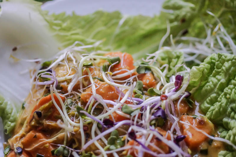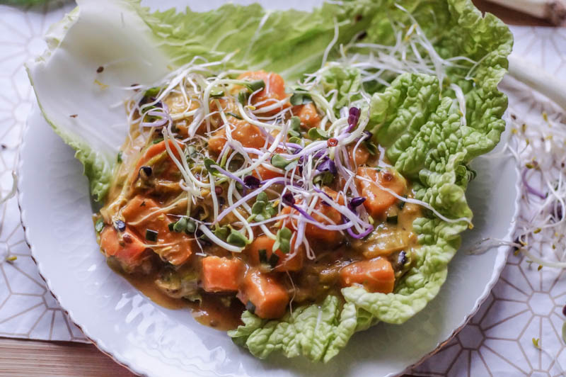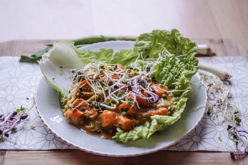 _Die Zwiebel in grobe Stücke schneiden und mit etwas Öl in einer Pfanne goldbraun anbraten. In der Zwicshenzeit die Süßkartoffeln gut waschen und ebenfalls in Stücke schneiden. In die Pfanne geben und alles gut anbraten/ durchziehen lassen. Chinakohl gut waschen und ein paar Blätter zur Seite legen um sie später zum Servieren zu nutzen. den Rest in feine Streifen schneiden und ebenfalls in die Pfanne geben, gut vermengen und kochen lassen. Etwas Wasser hinzufügen und würzen und abschmecken. Wer möchte kann gerne noch einen Schluck Kokosmilch hinzugeben um die Konsistenz etwas cremiger zu machen. Schnittlauch und restliche Gewürze zum Abschmecken benutzen und zuguterletzt die Sprossen hinzufügen und kurz mitverkochen. Wer mag kann auch ein paar zum Garnieren aufheben. Alles nochmal gut vermengen, abschmecken und nach Bedarf Gewürze oder Kokosmilch hinzufügen. In den Chinakohlblättern anrichten – und guten Appetit! :)