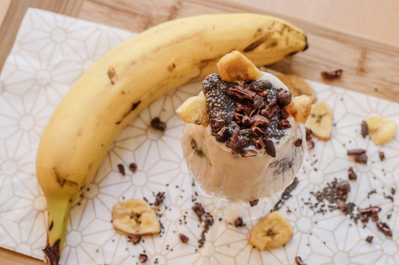 _Die Banane in Stücke schneiden und direkt in den Mixer geben. Die Chia-Samen währenddessen in heißem Wasser oder Milch separat quellen lassen. Zur Banane noch Haferflocken und Milch hinzugeben. Alles gut durchmixen und kurz stehen lassen, damit die Haferflocken quellen können. Es sollte eine breiige Masse entstehen, sollte dies nicht der Fall sein, dann noch etwas Haferflocken ergänzen. Nach ca. 15 Minuten könnt ihr etwas vom Bananen-Smoothie in ein Glas geben und ebenfalls von den Chia-Samen. Mit Bananenchips und Kakaonibs dekorieren und guten Appetit! :)