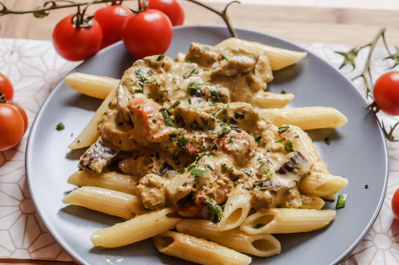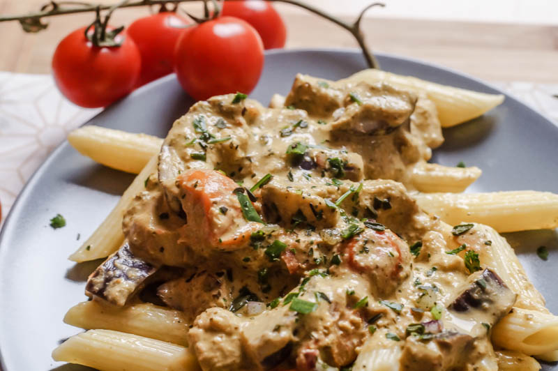 _Die Nudeln in heißem Wasser aufsetzen. In der Zwischenzeit die Zucchini und die Aubergine schneiden und mit etwas Öl in der Pfanne anbraten. Die Cocktailtomaten halbieren und ebenfalls hinzugeben. Gegebenenfalls etwas Wasser ergänzen um mehr Flüssigkeit zu haben. Wenn das Gemüse angebraten ist, kann das grüne Pesto ergänzt werden. Nun abschmecken mit Pfeffer, etwas Paprikapulver und Kräutern und je nach Geschmack noch etwas Milch, Sahne oder auch vegane Sahne hinzugeben. Alles gut vermengen und auf kleiner Hitze stehen lassen. Die Nudeln abgießen und alles zusammen servieren. Guten Appetit! Angeröstete Pinienkerne würden sich übrigens auch super zum Drüberstreuen eignen ;)