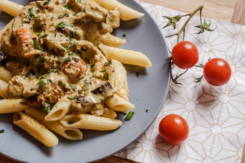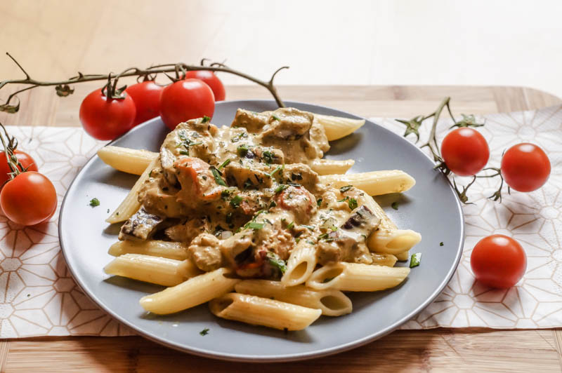 Denn dafür ist dieses bunte Gemüsepesto auf jeden Fall geeignet. Wenn ihr zusätzlich noch frische Zucchini und Tomaten aus dem Garten habt, die ihr extra für das Rezept ernten könnt, ist das Sommergefühl natürlich perfekt da. Eigenes Gemüse, Kräuter und Obst aus dem Garten zu haben ist einfach klasse und inspiriert einen zu neuen Rezepten! Nicht nur essenstechnisch, sondern auch zu neuen Getränkekreationen. So gibt es im Garten bei mir zum Beispiel zwei verschiedene Sorten Minze, die sich herrlich für erfrischende Getränke eignen. Zusätzlich ist auch der Versuch und die Hoffnung vorhanden, dass die Physalis gut wächst und Früchte trägt – diese eignen sich auch perfekt für Getränke oder Müslis. Wie ihr seht, kann so ein Garten ziemlich inspirierend sein – also Daumen drücken, dass alles gut wächst und gedeiht :) Doch nun erstmal viel Spaß mit dieser bunten Gemüsepfanne mit Pasta!