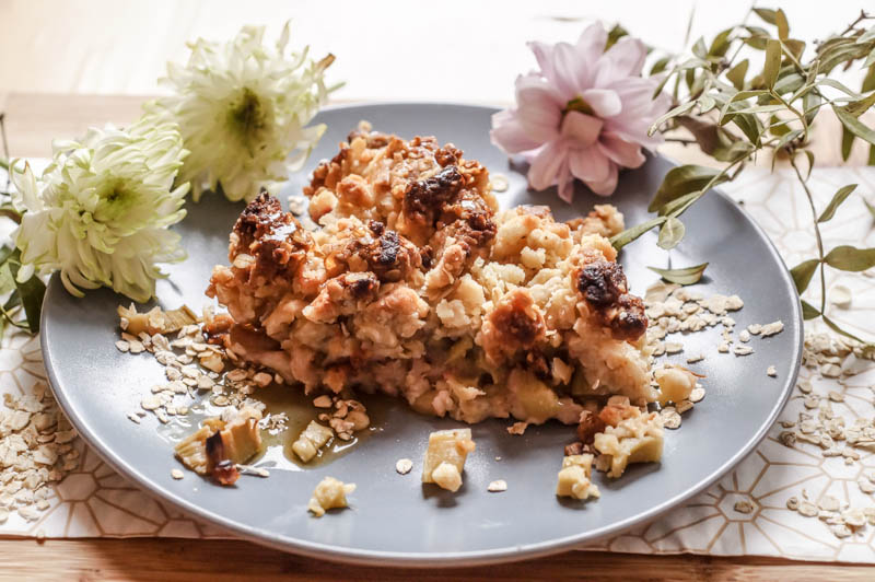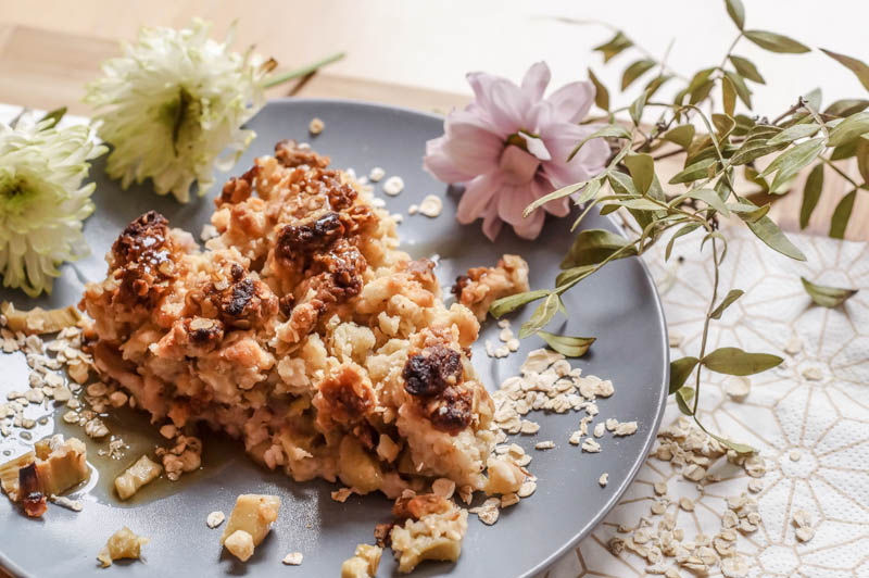 Und die Haferflocken, die ich genutzt habe, machen die Streusel zum einen nochmal etwas „streusliger“, erfrischend knusprig und zum anderen sogar gesund. Denn man kann herkömmliches Mehl zu einem Anteil mit feinen Haferflocken ersetzen und hat somit Ballaststoffe, Proteine und Vitamine in seinen Crumble integriert. So wird aus einem allseits bekannten Crumble ganz schnell eine gesunde Variante, die im Geschmack ebenfalls ein absolutes Highlight ist. Doch Haferflocken enthalten nicht nur wichtige Ballaststoffe und Vitamine, sondern sind im wahrsten Sinne des Wortes auch richtige Alleskönner. Aus dem Grund gibt es unter Hafer – Die Alleskörner jede Menge Informationen zu verschiedenen Hafersorten, Ernährung mit Hafer und noch vielen weiteren Haferrezepten. Dort findet ihr auch detaillierte Informationen zu Nährwerten und wie man Hafer im Alltag oder auch in der Sportroutine integrieren kann.