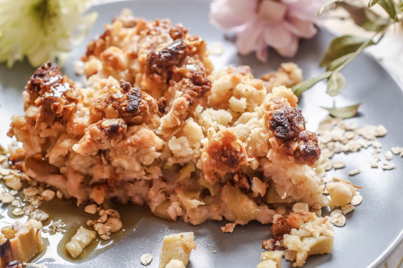 Und was soll ich sagen – es war die perfekte Entscheidung und zwar so sehr, dass das Rezept unbedingt nochmal in der Rhabarbersaison wiederholt werden muss. Die Säure des Rhabarbers harmoniert einfach perfekt mit den süßen Hafer-Streuseln!