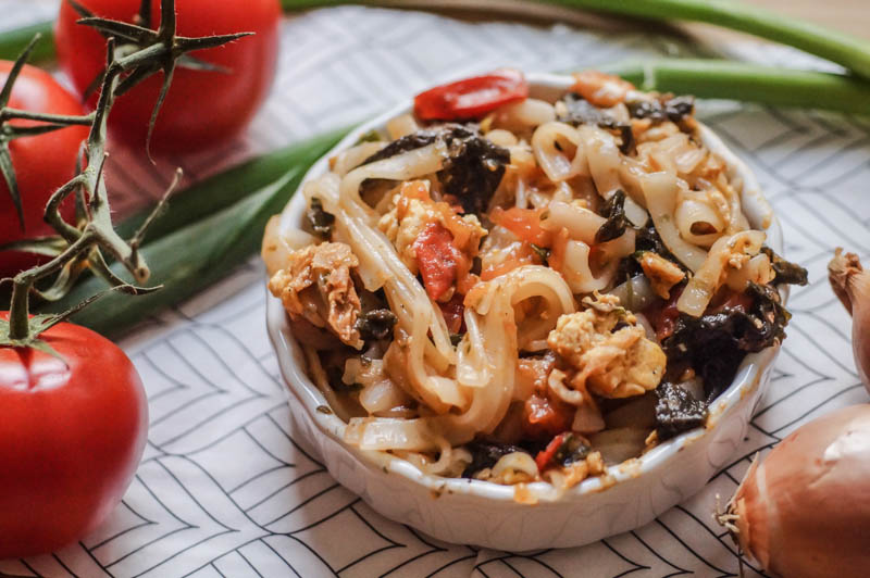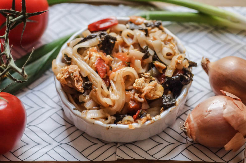 Da dies nicht immer ohne Weiteress möglich ist, habe ich mir letztens einfach ein Gericht gezaubert, das mich an Reisen und entfernte Orte erinnert. So ist nämlich mein heutiges Rezept entstanden und wer mich kennt, weiß, dass ich ein riesen Fan von solchen Gerichten bin. Aus dem Grund war schnell klar, dass ich zu den Reisnudeln noch gebratenes Gemüse und Ei hinzugebe um mich damit in ferne Länder träumen zu können. Gewürzt wurde das Ganze mit Panang Curry Paste, Sojasauce und Pfeffer. Wer mag kann noch einen Schuss Dattelsirup hinzugeben – der Mix aus süß und würzig ist hier wirklich empfehlenswert!