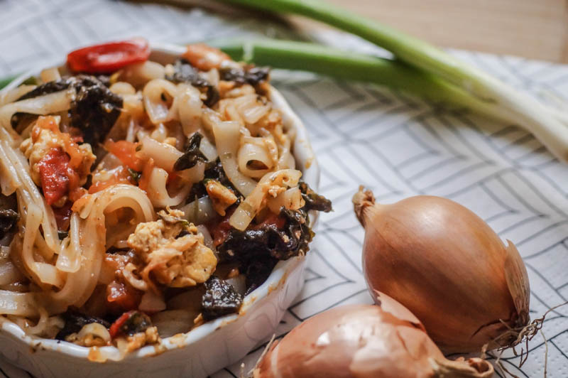 _Die Reisbandnudeln in kochendem Wasser aufkochen und danach gut ziehen lassen. In der Zwischenzeit die Zwiebeln und Lauchzwiebeln klein schneiden und mit etwas Öl in der Pfanne anbraten. Hierzu gebt ihr nun auch die Panang Curry Paste gem. Dosierung auf der Packung (ich habe hier ungefähr 1-2 TL genommen). Wenn die Zwiebeln goldbraun sind, werden sie auf die eine Seite der Pfanne geschoben. Auf der anderen Seite macht ihr nun das Rührei. Die Tomaten in kleine Stücke schneiden, ebenfalls in die Pfanne geben und alles gut vermengen. Wenn die Nudeln durchgezogen sind, auch diese in die Pfanne geben, unterrühren, würzen und abschmecken. Guten Appetit!