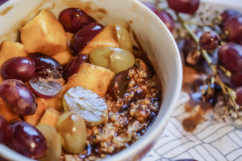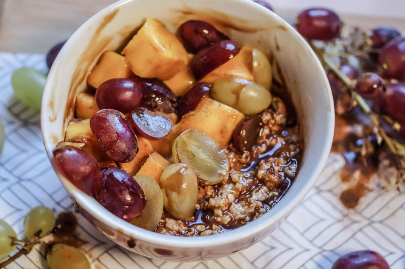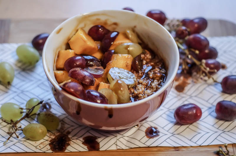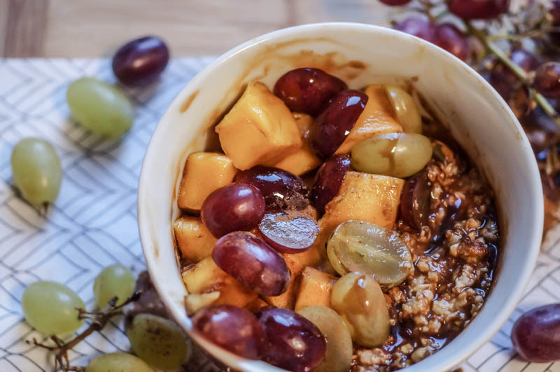 Und damit genau dies nicht der Fall ist, habe ich heute ein neues Rezept für euch kreiert. Es ist ein herbstliche Porridge mit Mango und Trauben. Das herbstliche daran ist übrigens der Zimt und der Dattelsirup, der dieses Porridge perfekt für einen gemütlichen Start in den Tag macht oder auch als wärmender Snack nach einem Herbstspaziergang verwendet werden kann.