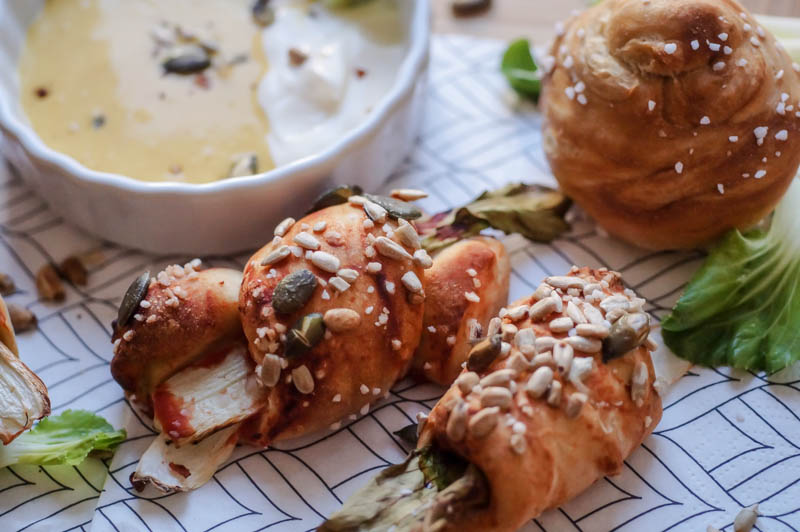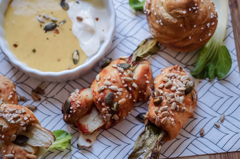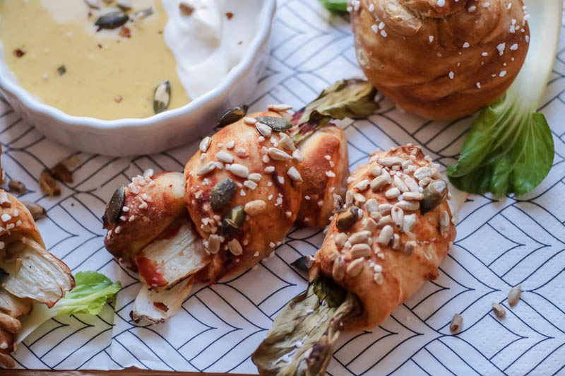 In meinem Fall ist es sogar sehr lecker geworden. Um den Pak Choi noch etwas süß-frisch zu machen, kann ich es nur empfehlen ihn etwas anzubraten und anschließend zu karamellisieren. Danach wird er in den Laugenteig eingerollt und mit grobem Meersalz und bunten Körnern bestreut. Der Laugensnack muss dann nur noch in den Backofen und danach wird er mit Dips wie Aioli, Sour Cream oder Kokos-Curry serviert. Also lasst euch diesen kreativen und besonderen Snack für zwischendurch gut schmecken! :)