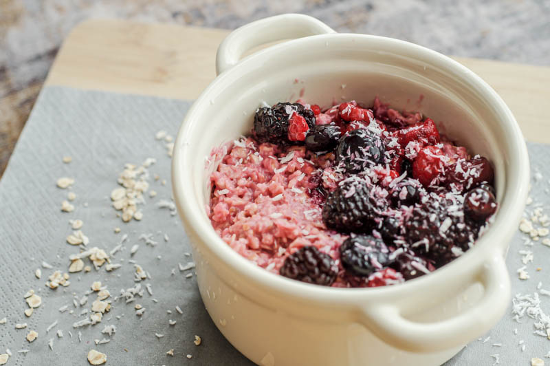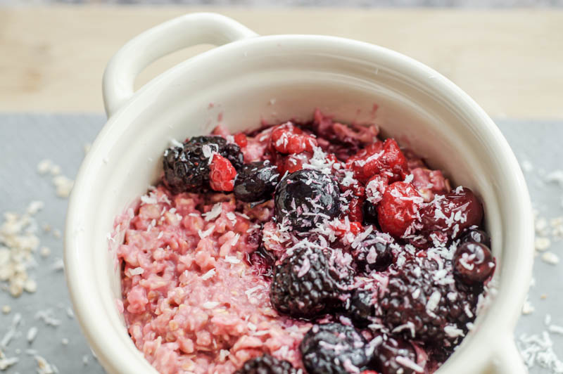 Was der kleine Trick ist, das wird schon in der Überschrift verraten – das Porridge bekommt nämlich eine herrlich pinke Farbe. Das Auge isst schließlich bekanntermaßen mit und so ein pinkes Porridge ist doch dann schon mal was ganz anderes und besonderes. Und die pinke Farbe bekommt ihr ganz einfach ohne Lebensmittelfarbe hin. Ihr braucht nichts mehr als Rote-Beete-Saft, mit dem ihr die Haferflocken einfärbt. Dazu kommen dann noch rote Beeren um das Gesamtbild stimmig abzurunden.