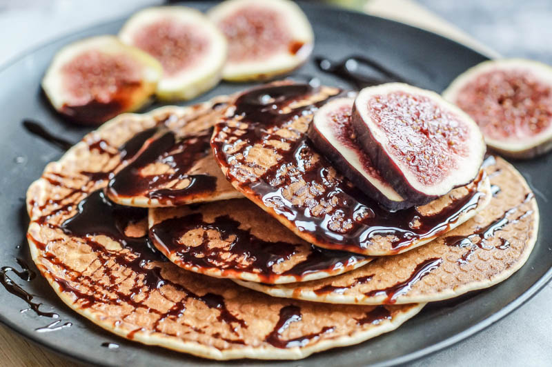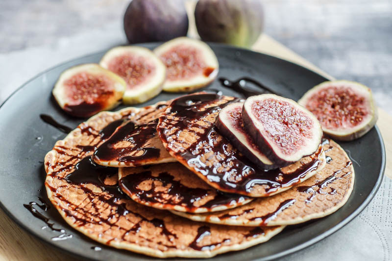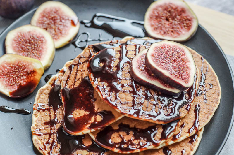 Die Pancakes sind übrigens zuckerreduziert und stattdessen mit einer halben Banane und Proteinpulver zubereitet. Sozusagen die sportlichere und etwas gesündere Variante als die klassischen Pancakes. Natürlich sind sie trotzdem ein süßes Rezept, doch egal ob nachmittags oder morgens zum Frühstück – sie schmecken einfach gut und dank den Feigen in Kombination mit dem Dattelsirup einfach passend zum Herbststart!