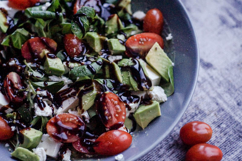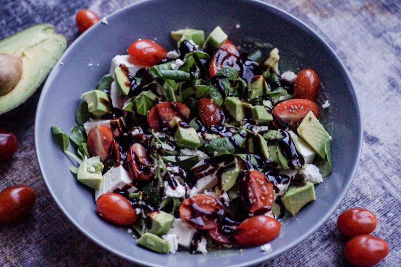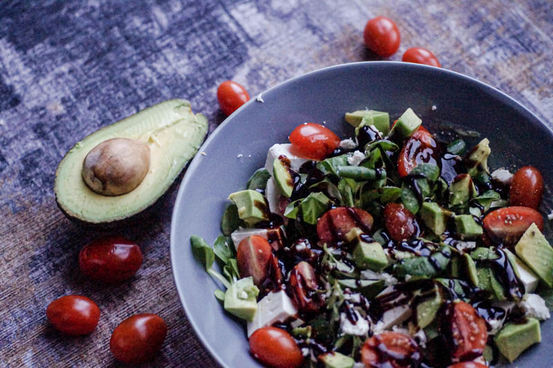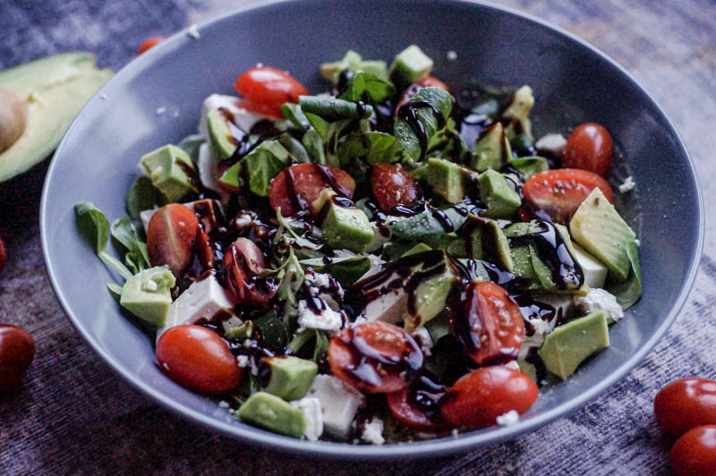 Früher hieß es mal, je mehr Farben auf dem Teller sind, desto besser. Das ist in meinem heutigen Rezept auf jeden Fall zutreffend! Denn hiermit zeige ich euch einen erfrischenden, bunten Salat. Zum Feldsalat kombiniert ihr Avocado und Tomate und Hirtenkäse oder eine vegane Variante davon. Dazu ein Avocadodressing und etwas Balsamico on top – am besten wie hier einen Feigenbalsamico für die fruchtige Note. Dazu noch Sonnenblumenkerne und schon habt ihr euch einen bunten und gesunden Salat gezaubert. Der Salat schmeckt übrigens sowohl als Beilagensalat als auch als sommerliche Hauptspeise mit einem frischen Kräuterbaguette.