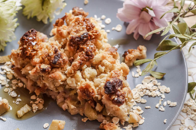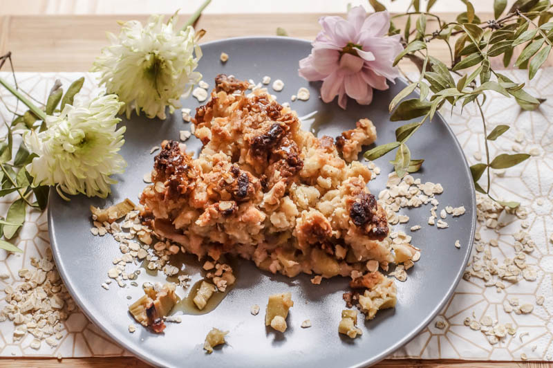 Und was soll ich sagen – es war die perfekte Entscheidung und zwar so sehr, dass das Rezept unbedingt nochmal in der Rhabarbersaison wiederholt werden muss. Die Säure des Rhabarbers harmoniert einfach perfekt mit den süßen Hafer-Streuseln!